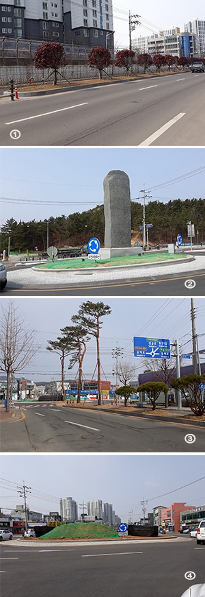첫번째는 도심 한복판을 가로지르는 도로 중앙에 나무를 식재하여(사진 ①) 많은 주민들이 그 의도와 효율성을 궁금해 했다. 화단과 나무로 인해 중앙선을 넘어오는 차량에 의한 사고위험은 줄었다. 반대로 도로 중앙선 자리에 화단이 들어선 만큼 도로가 좁아졌다.