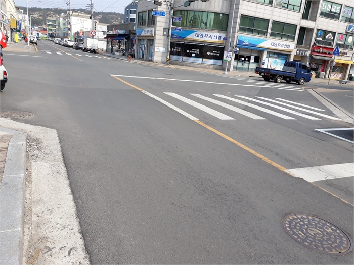 도로바닥에 건널목 표시가 없으니 건너면 무단횡단이다. 태안군이 몇달째 주민들의 무단횡단을 유도하고 있다. 차량운전자들 시각에는 건널목이 없어 사고발생시 분쟁원인 가능성이 높다.