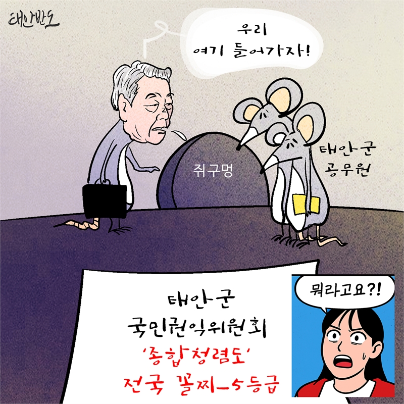 태안반도 만평 2025. 12. 31.자 국민권익위원회에서 지난 23일 발표한 전국 기초자치단체 청렴도 조사에서 태안군이 종합청렴도 5등급을 받았다. 종합청렴도는 1등급에서 5등급까지 구분하며 5등급은 전국 꼴찌에 해당된다. 0 0 태안반도 태안반도 grnews@naver.com 태안반도의 기사 더보기 저작권자 ⓒ 태안반도, 무단 전재 및 재배포 금지