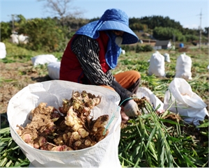 태안반도 생강이 이달 초부터 본격적인 출하를 시작했다.국내 생강의 주산지로 손꼽히는 태안에서는 이달 현재 429농가가 총 160ha 면적에서 생강을 재배하고 있다. 올해는 봄철 저온 및 여름철 고온으로 생육이 다소 저조해 지난해 대비 약 5% 가량 생산량 감소가 예상된다. 생강은 인도 의학서적 ‘아유르베다(Ayurveda