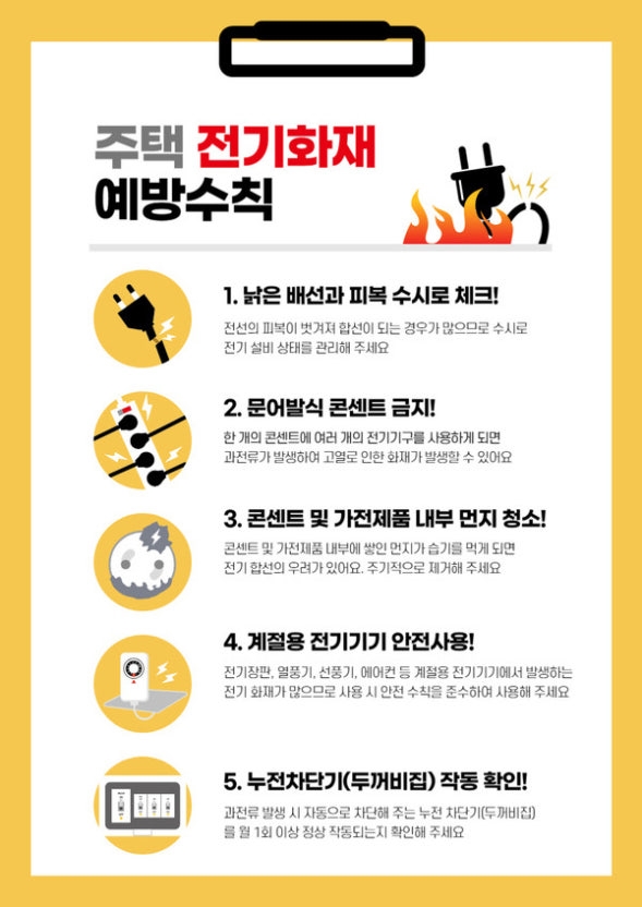 최근 잦은 비로 인한 습기와 누전 위험이 높아지면서 전기화재 발생 가능성이 커지고 있다전기화재의 주요 원인은 ▲먼지와 습기가 쌓여 누설전류와 불꽃이 반복적으로 발생하는 트래킹 현상 ▲전로에 허용 전류 이상의 전류가 흐르는 과부하 현상 ▲노후화된 전기기구로 인한 합선 및 단락 등으로 나눌 수 있다. 특히 강우가 잦은 시기에