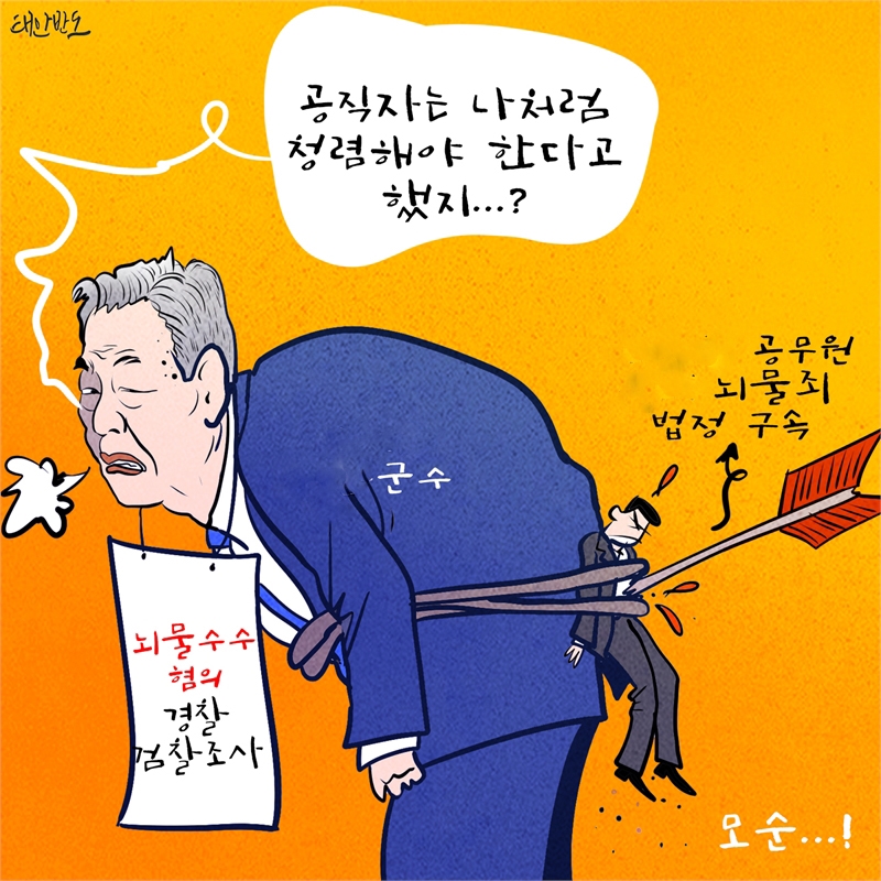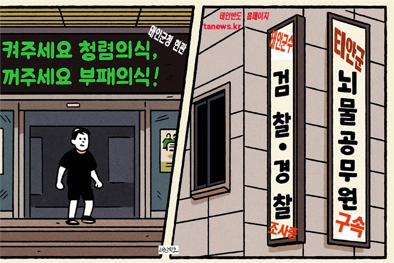 태안군청 현관 입구 전광판에 공직자들의 청렴을 강조하는 문구를 종일 보여주고 있다. 반면, 태안반도 신문사는 태안군 공무원의 뇌물수수 구속 사건과 태안군수의 검찰, 경찰 조사중인 사실을 보도하고 있다.