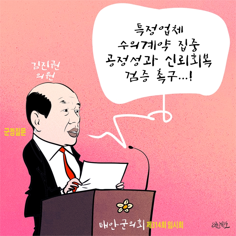 태안군의회 김진권 의원 제314회 임시회 군정질문 주요내용 “특정업체에 수의계약 집중, 공정성과 신뢰회복 위한 철저한 검증 촉구”