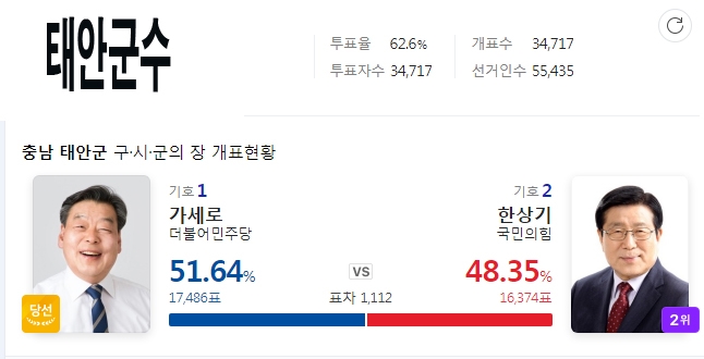 제8회 전국동시지방선거 태안군수선거에 더불어민주당 가세로 후보가 국민의힘 한상기 후보를 누르고 당선됐다.(사진_중앙선거관리위원회 개표결과) 0 0 태안반도 태안반도 grnews@naver.com 태안반도의 기사 더보기 저작권자 ⓒ 태안반도, 무단 전재 및 재배포 금지