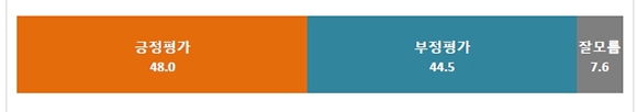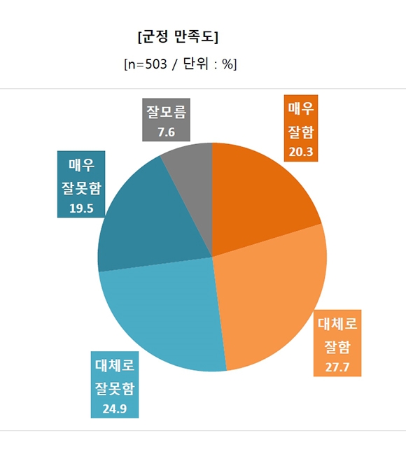 가세로 태안군수의 군정운영과 관련한 만족도 조사에서는 긍정평가 48.0%, 부정평가 44.5%로 집계됐다.