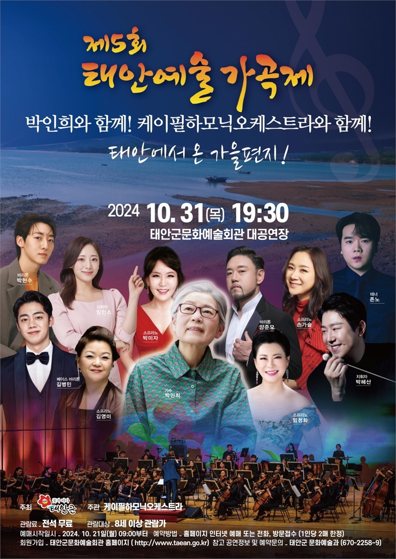 태안군이 주최하고 케이필하모닉오케스트라가 주관하는 제5회 태안예술가곡제가 오는 10월 31일(목) 오후 7시 30분 태안군문화예술회관 대공연장에서 열린다.