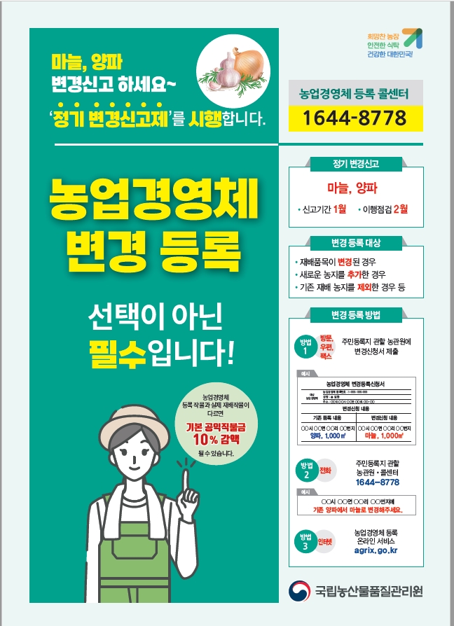 농관원, 양파·마늘 자조금 단체와 협력하여 등록정보 정기 변경 신고제 운영국립농산물품질관리원 서산태안사무소(소장 서충남, 이하 농관원)는 1월 2일부터 31일까지 양파·마늘을 경작하는 농업경영체를 대상으로 등록정보에 대한 ‘정기 변경신고 기간’을 운영한다고 밝혔다.