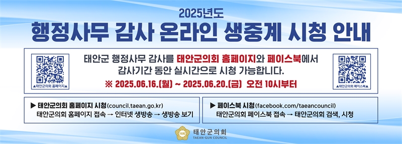 자치|행정 > 태안군의회 태안군의회 행정사무감사 생중계 시청 안내 태안반도 승인 2025.05.30 11:07 0 태안군의회 태안군의회(의장 전재옥)가 6월 16일부터 20일까지 행정사무감사 장면을 온라인 생중계를 실시한다. 생중계는 태안군의회 홈페이지를 접속해 '인터넷 생방송'이나 페이스북 태안군의회 계정에서 실시간 중계된다. 0 0 태안반도 태안반도 grnews@naver.com 태안반도의 기사 더보기 저작권자 ⓒ 태안반도, 무단 전재 및 재배포 금지