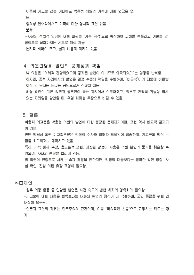 더욱이 박 의원은 해당 발언이 “비공식 간담회”에서 나온 말이므로 악의적 왜곡이라고 주장하지만, 의정활동 중 이루어진 발언은 기본적으로 공적 책임을 수반한다. 발언의 장소가 공개석상인지 여부는 책임의 본질을 바꾸지 않는다.
